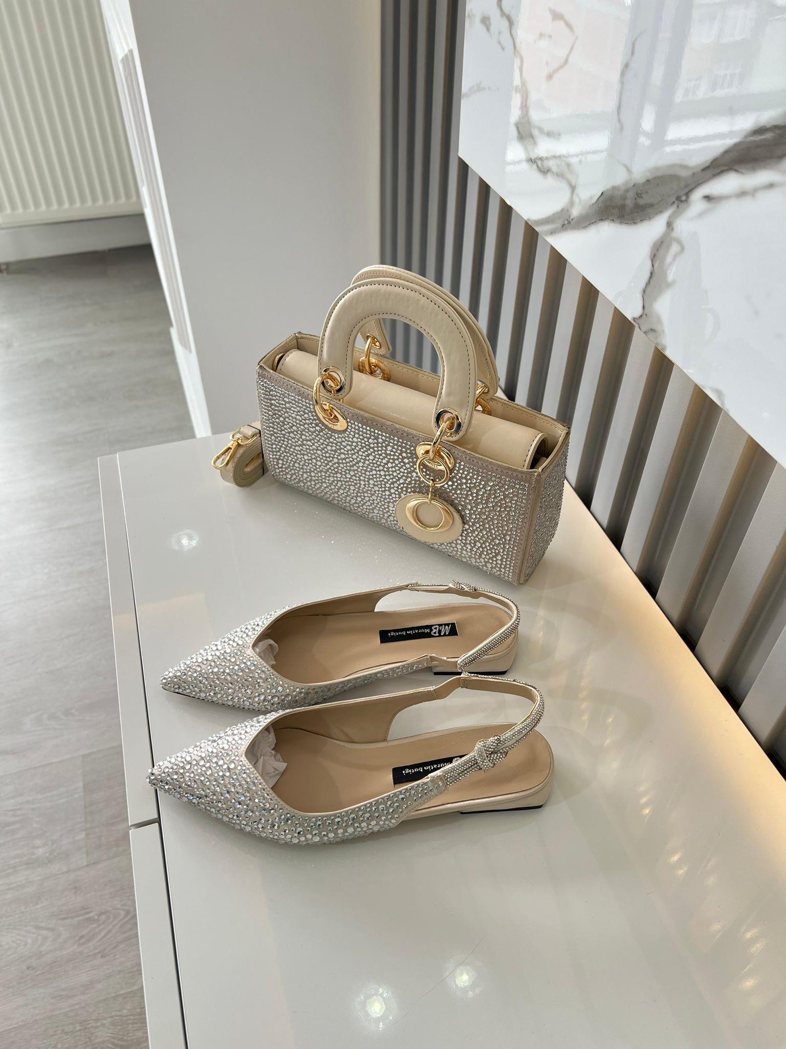 BEJ SATEN TAŞ DETAY KADIN BABET VE KOMBİN ÇANTA