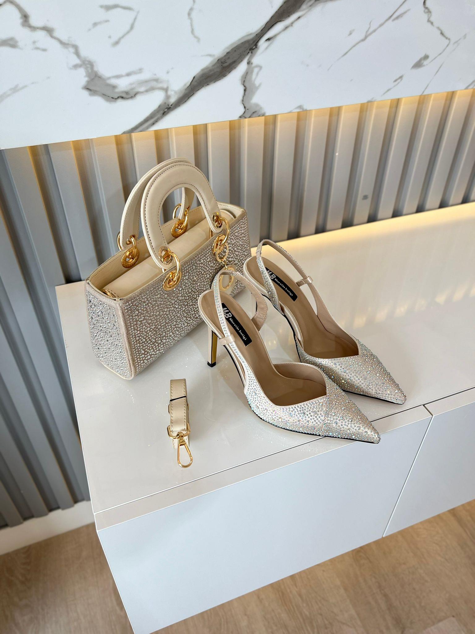 BEJ SATEN TAŞ DETAY KOMBİN KADIN TOPUKLU VE ÇANTA  (2412)