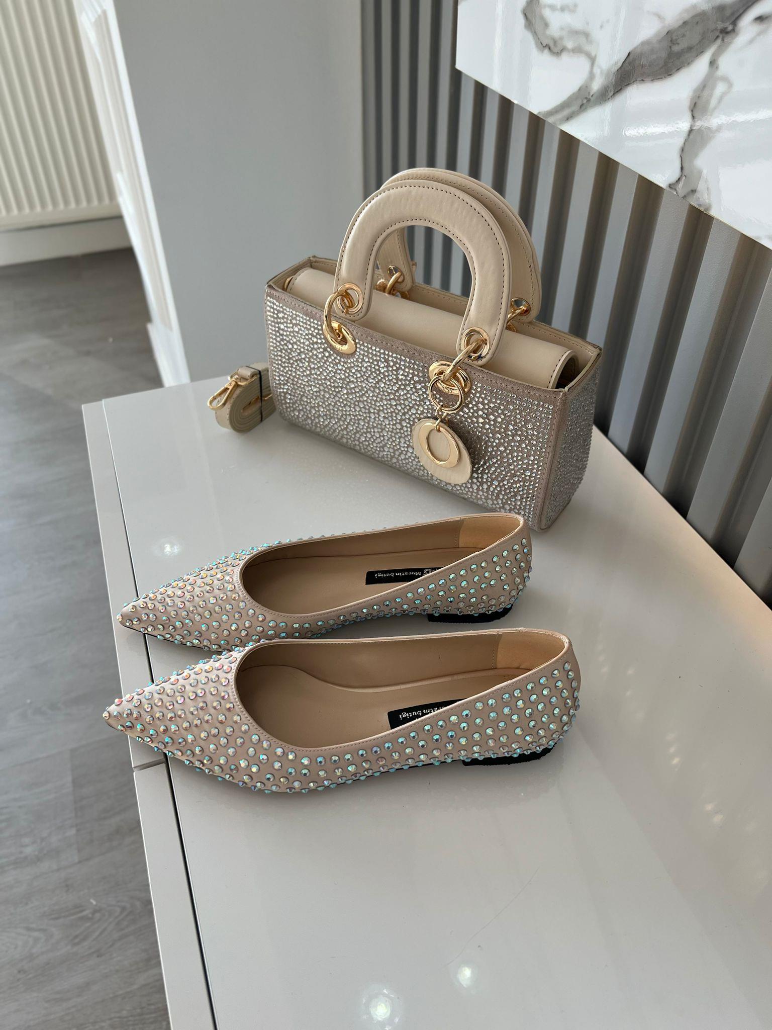 DAVİN BEJ SATEN TAŞ DETAY KADIN KOMBİN BABET VE ÇANTA VE