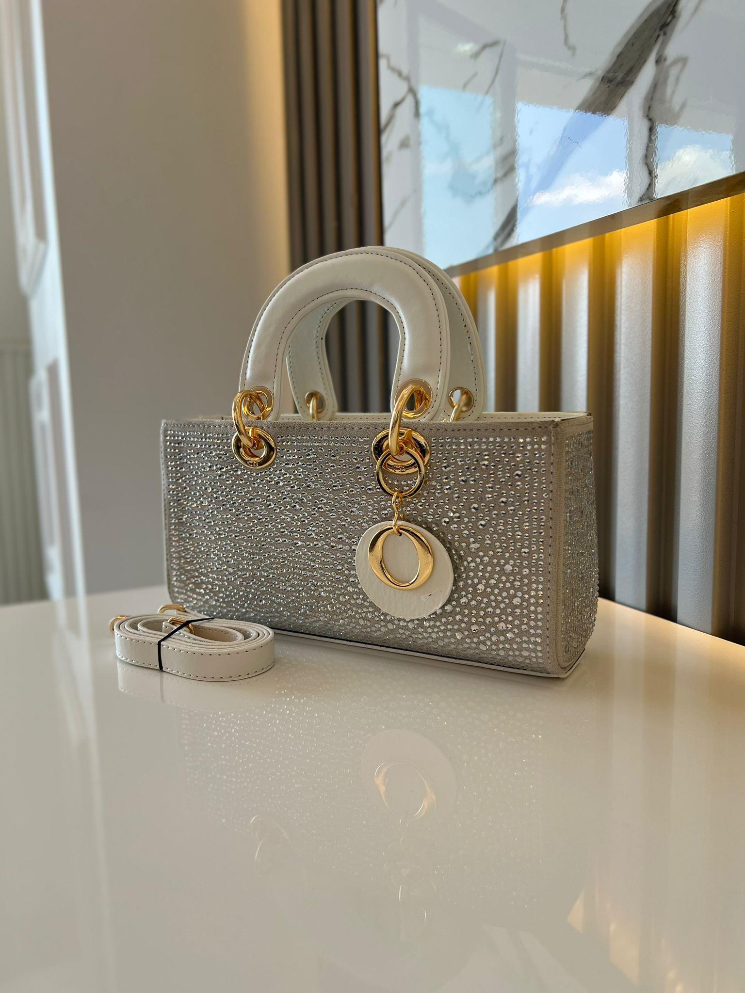 DİAMOND TAŞLİ ÇANTA BEYAZ Çanta ölçüm boy 14 cm genişlik  27 cm İçerisinde bir adet fermuarlı cep bulunmaktadır ve bir adet Gold detaylı askı bulunmaktadır (116)