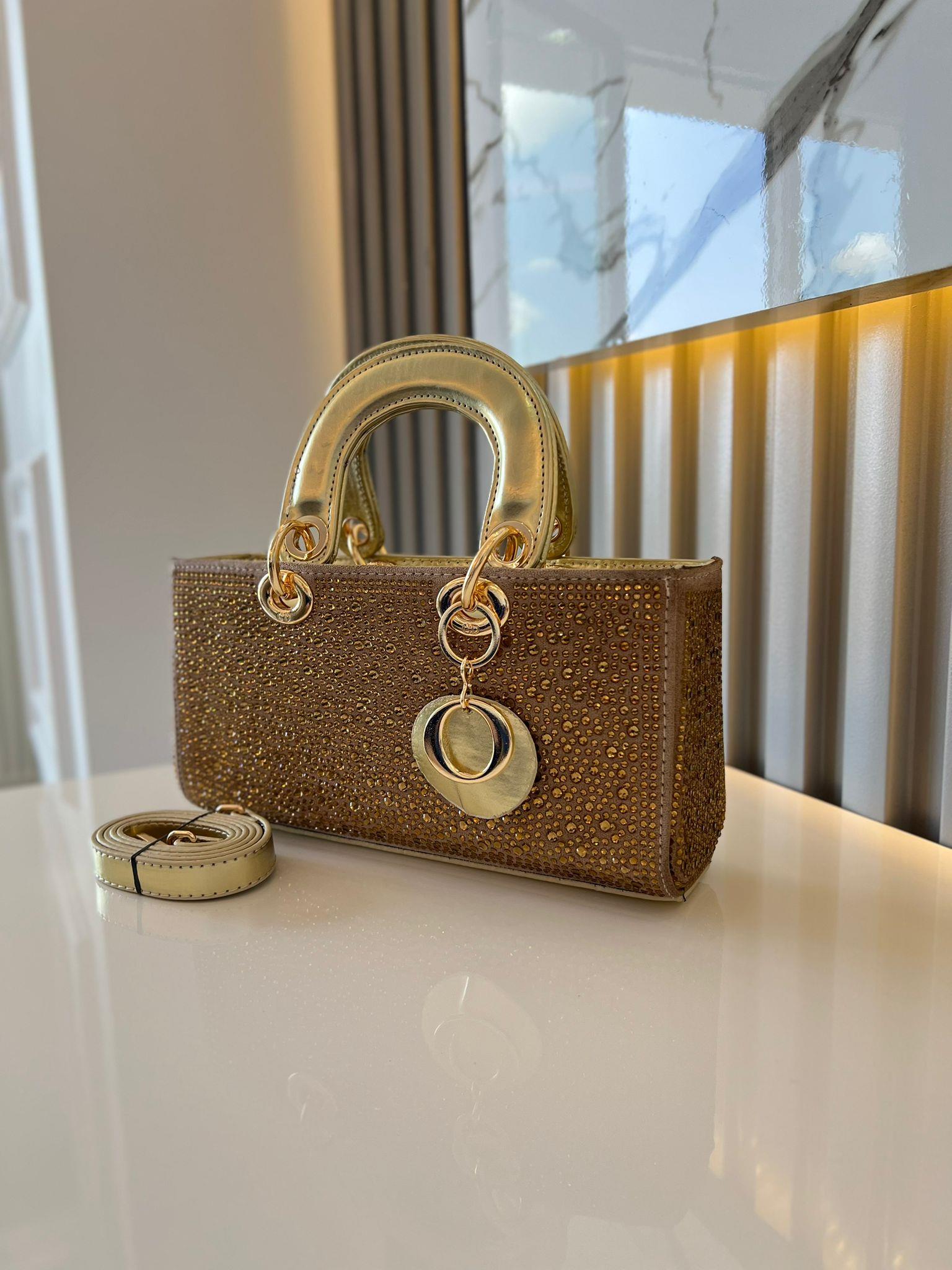 DİAMOND TAŞLİ ÇANTA GOLD Çanta ölçüm boy 14 cm genişlik  27 cm İçerisinde bir adet fermuarlı cep bulunmaktadır ve bir adet Gold detaylı askı bulunmaktadır