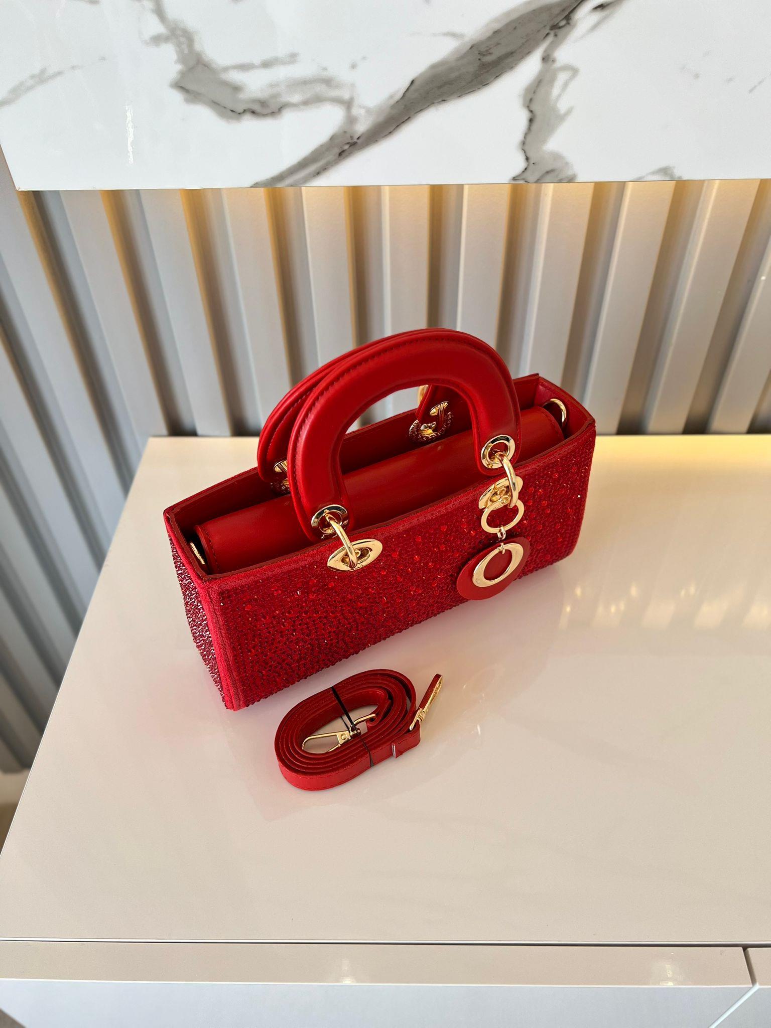DİAMOND TAŞLİ ÇANTA KIRMIZI Çanta ölçüm boy 14 cm genişlik  27 cm İçerisinde bir adet fermuarlı cep bulunmaktadır ve bir adet Gold detaylı askı bulunmaktadır