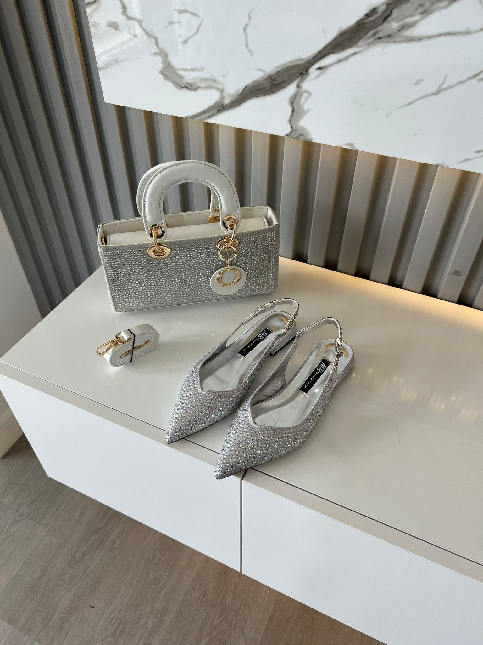 GÜMÜŞ SATEN TAŞ DETAY KADIN BABET VE KOMBİN ÇANTA