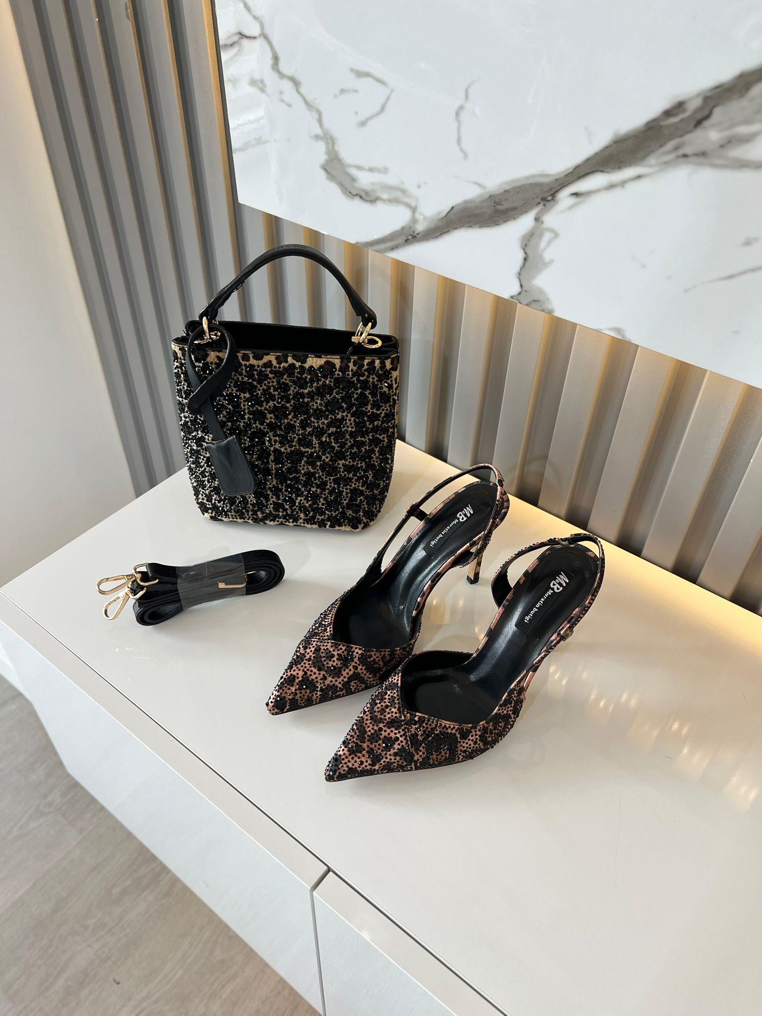 LEOPAR SATEN TAŞ DETAY KOMBİN KADIN TOPUKLU VE ÇANTA  (2412)