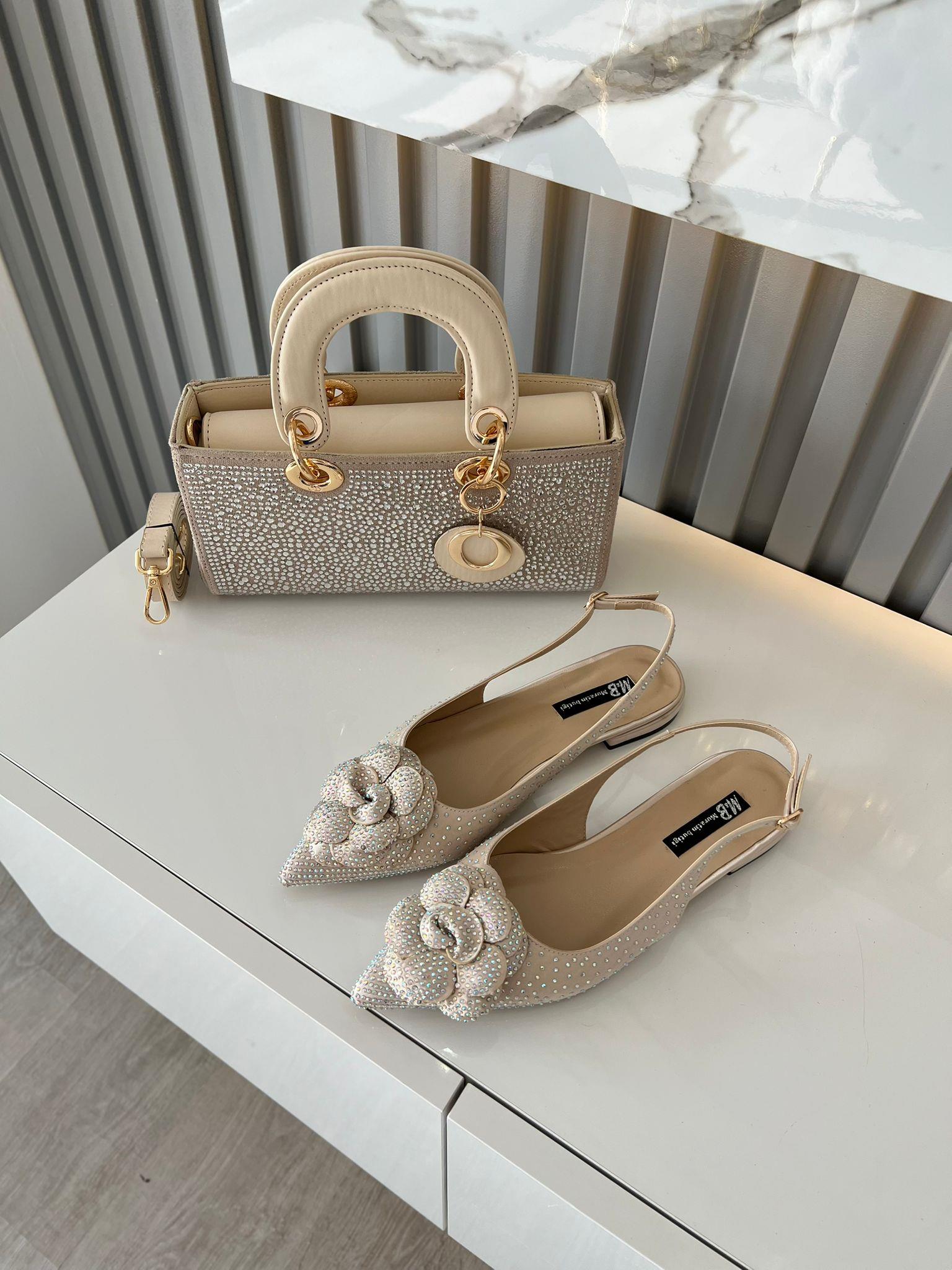 Taş süslemeli gül detaylı sivri burun bej renk kadın ayakkabı çanta kombin (6565)