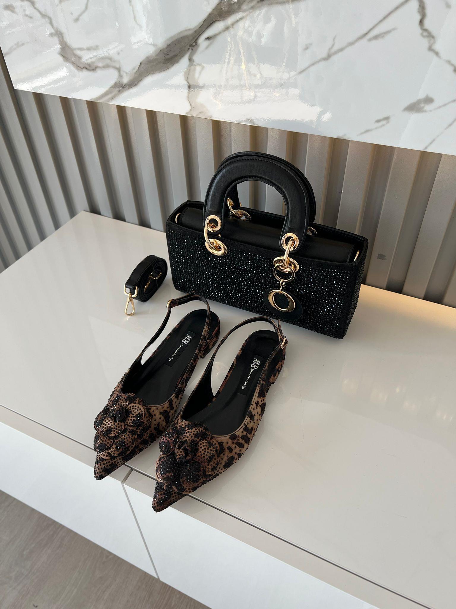 Taş süslemeli gül detaylı sivri burun leopar renk kadın ayakkabı çanta kombin
