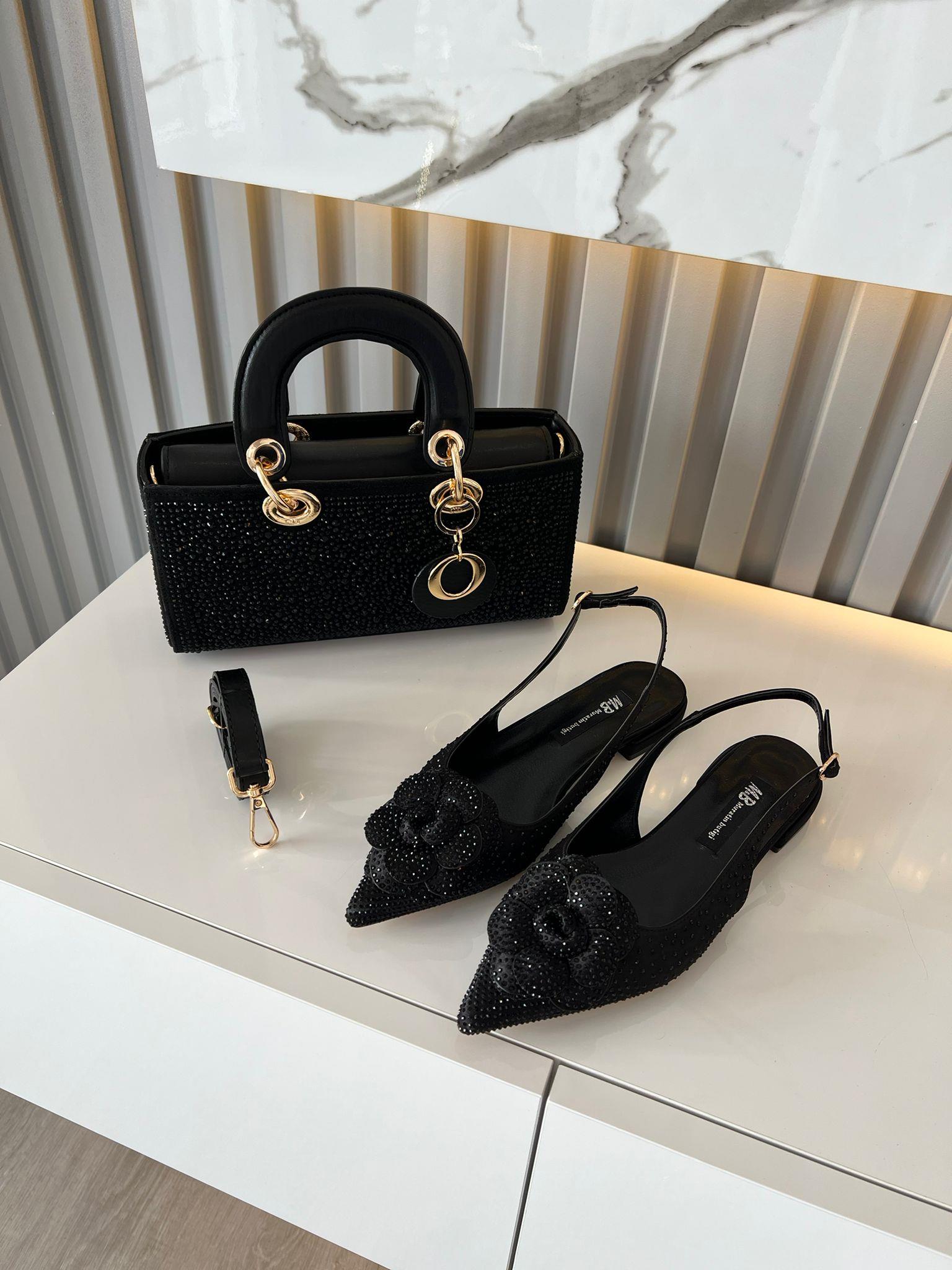 Taş süslemeli gül detaylı sivri burun Siyah renk kadın ayakkabı çanta kombin (6565)