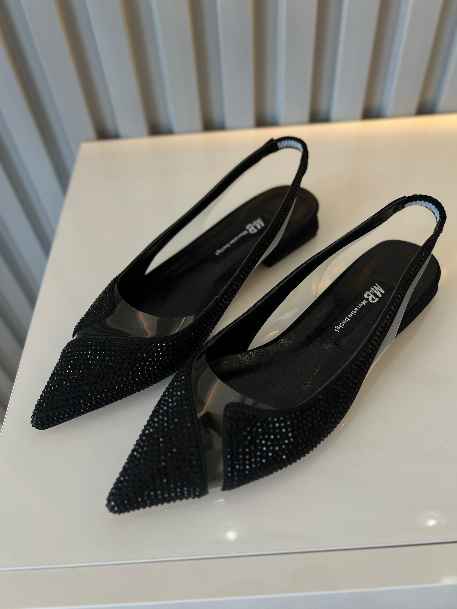 Taş süslemeli, şeffaf detaylı, sivri burun siyah babet (0545)