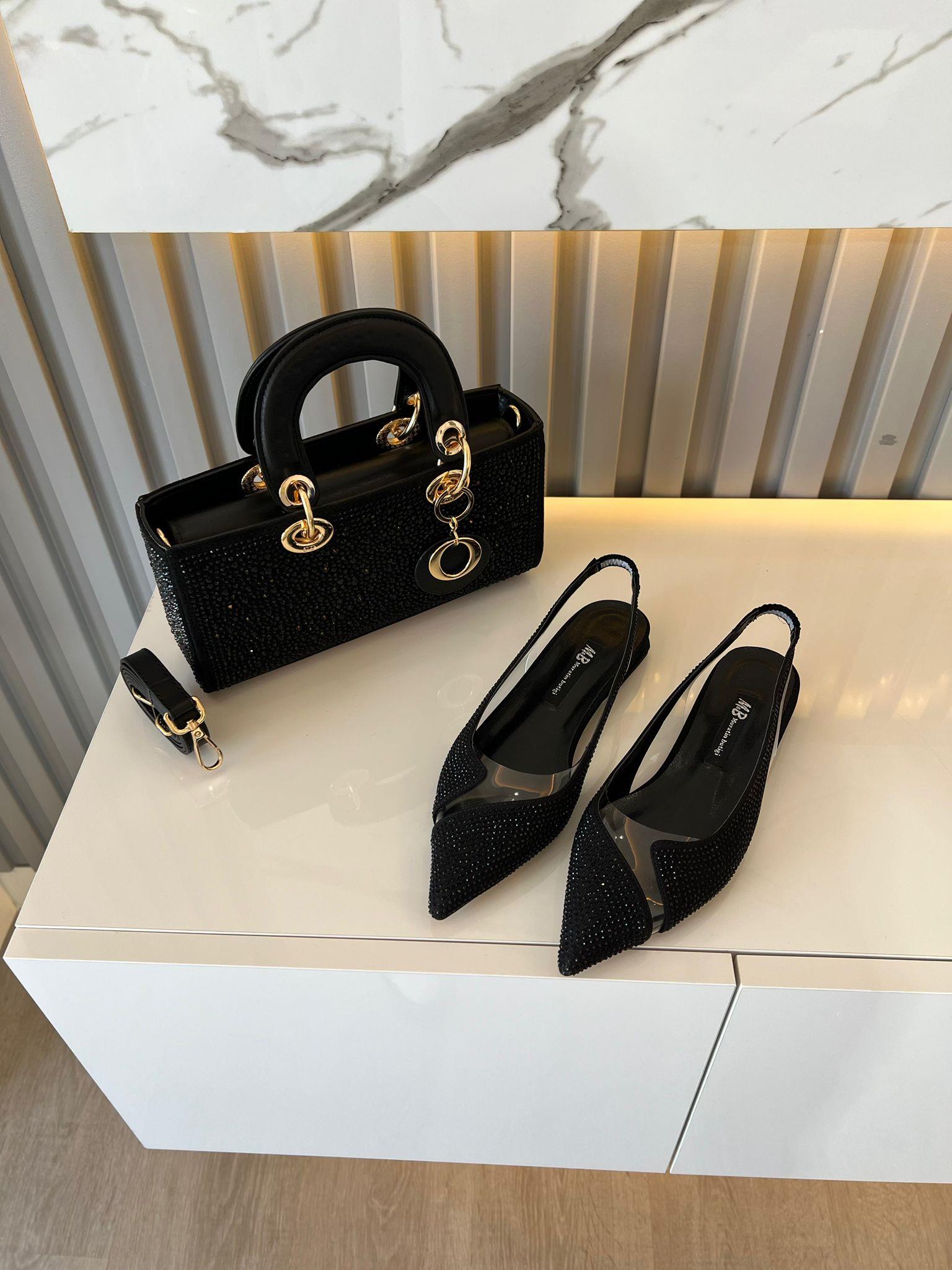 Taş süslemeli, şeffaf detaylı, sivri burun siyah babet ve kombin SİYAH DİAMOND TAŞLİ ÇANTA