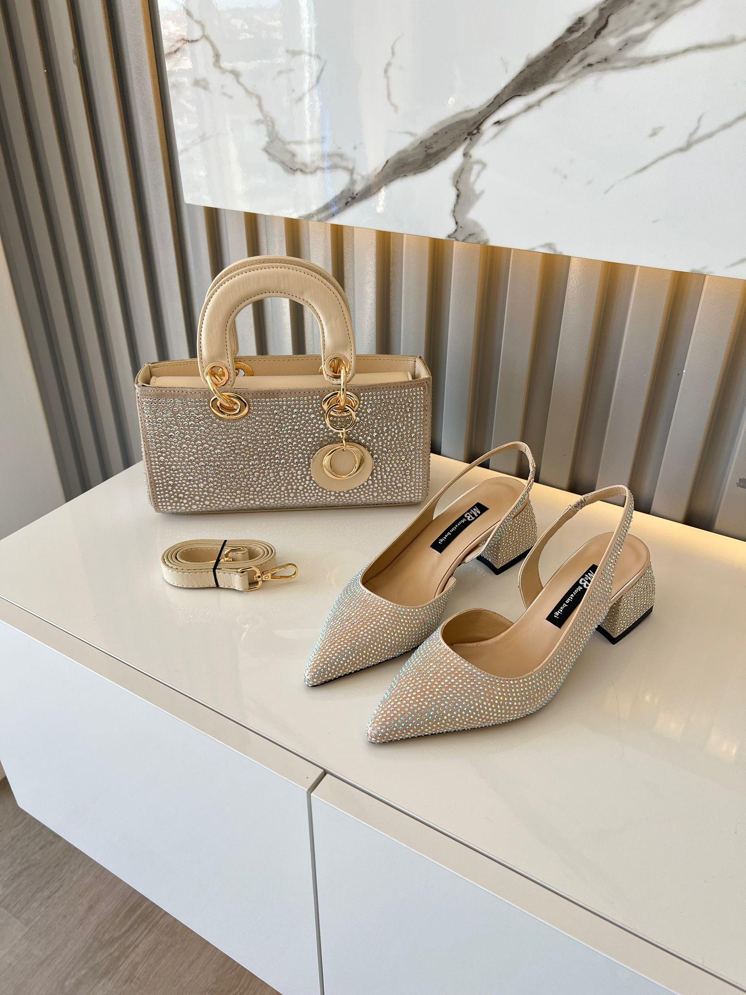 WANDA BEJ SATEN TAŞ DETAY KOMBİN KADIN TOPUKLU AYAKKABI ÇANTA (1212)
