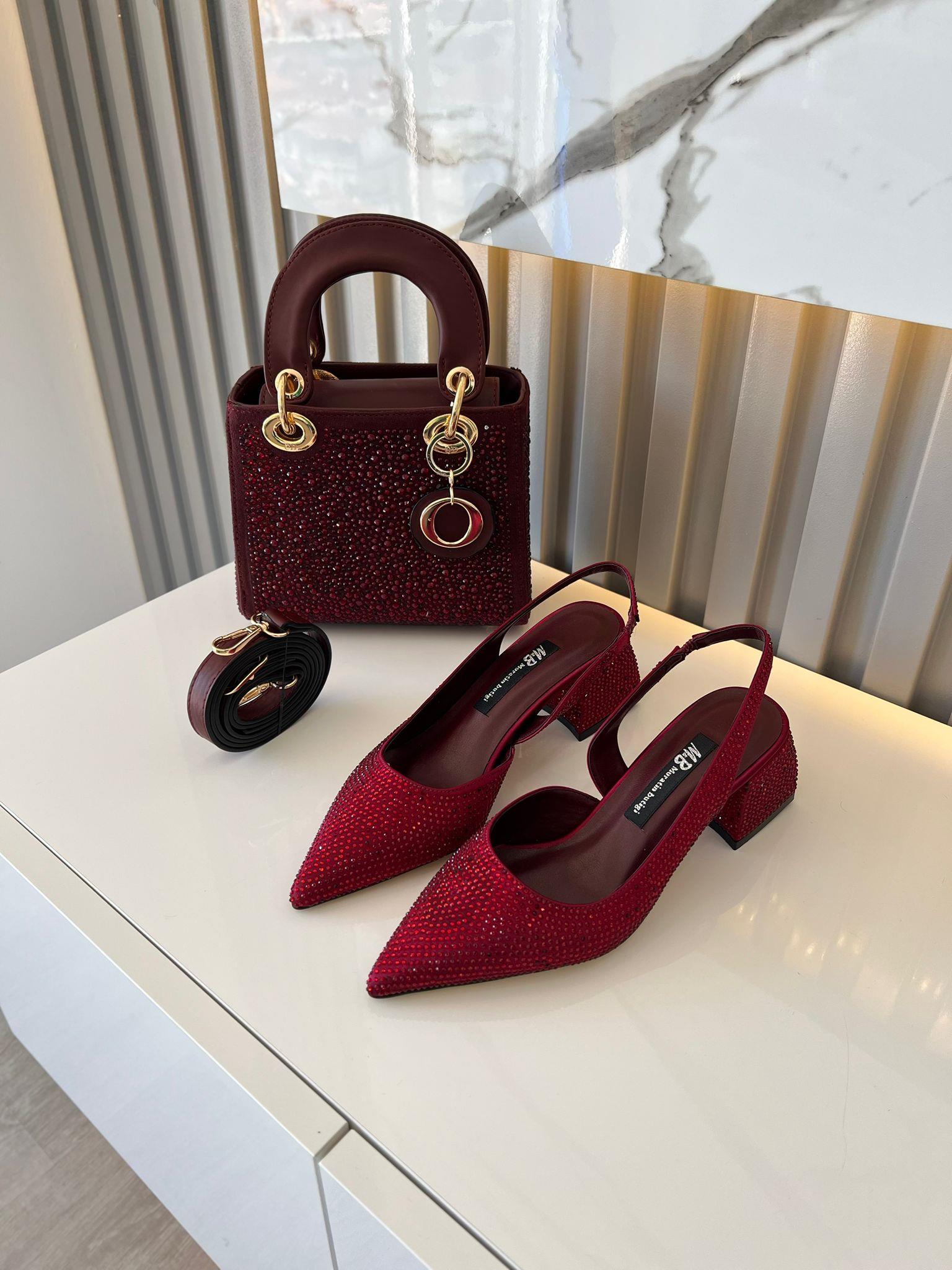 WANDA  BORDO  SATEN TAŞ DETAY KOMBİN KADIN TOPUKLU AYAKKABI ÇANTA