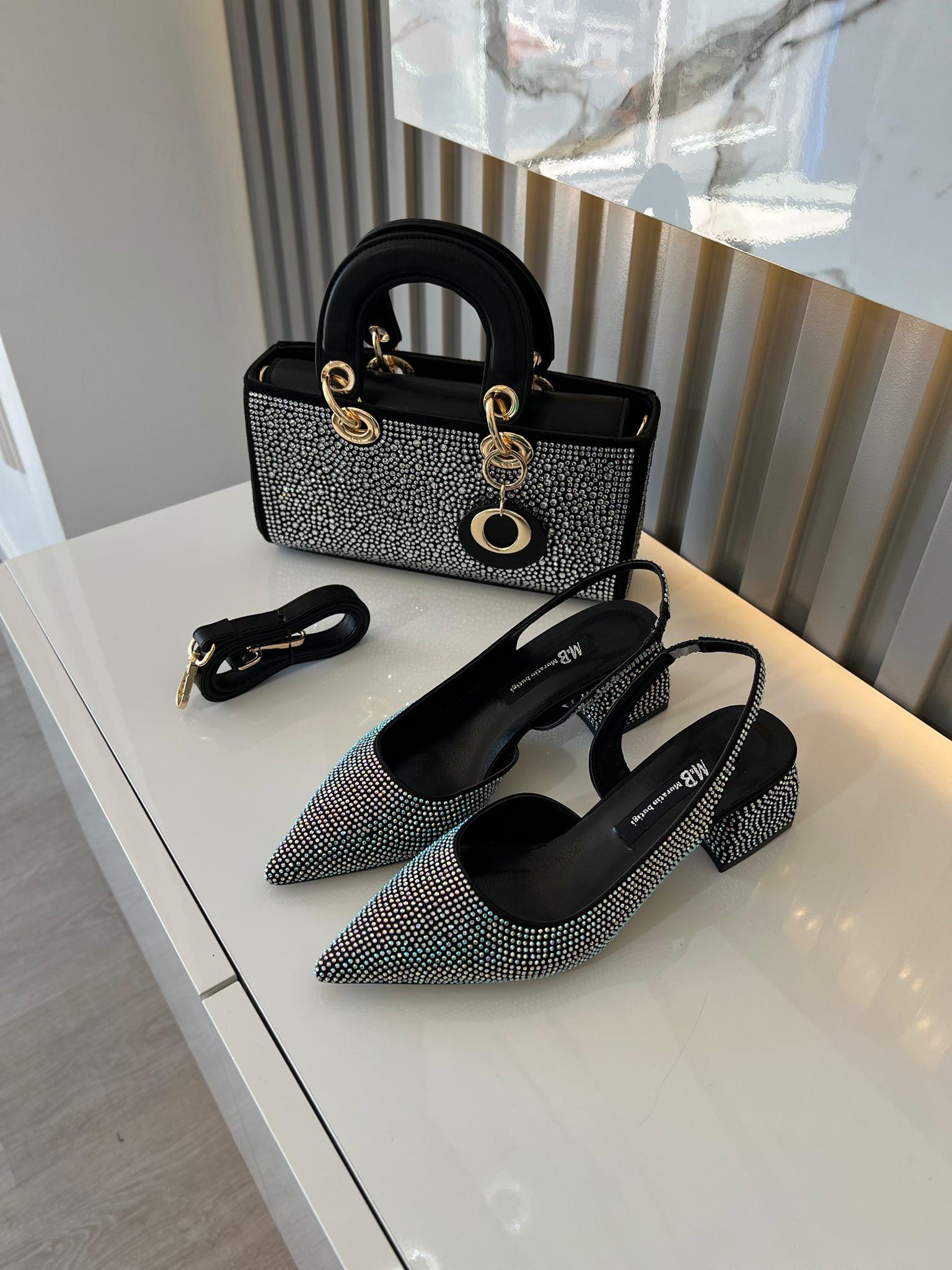 WANDA  SİYAH RENG SANCAN TAŞ  SATEN TAŞ DETAY KOMBİN KADIN TOPUKLU AYAKKABI ÇANTA