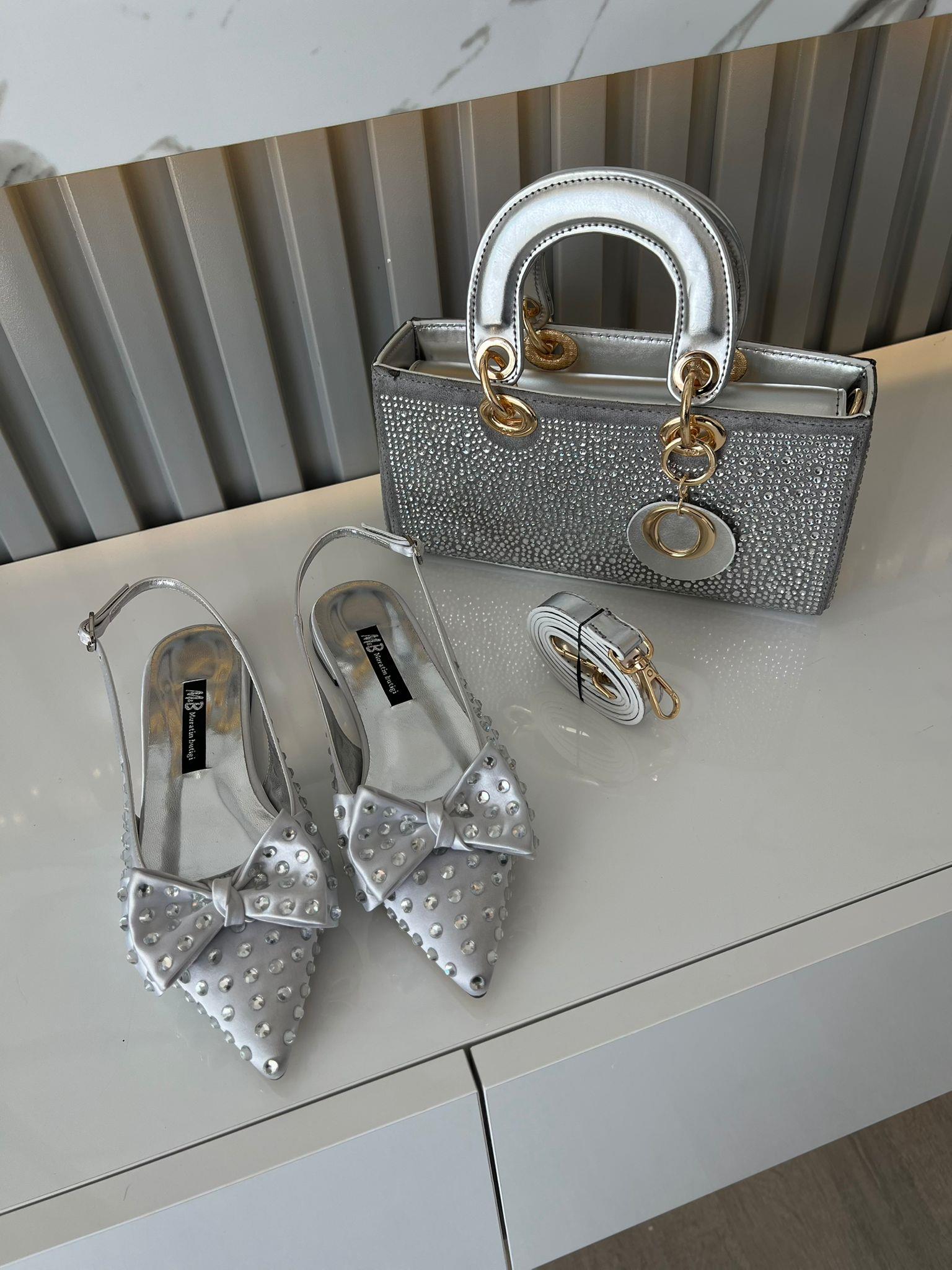 Zarif Fiyonk Detayı ve Taş Işıltısıyla Göz Kamaştıran GÜMÜŞ RENK  Ayakkabı çanta kombin